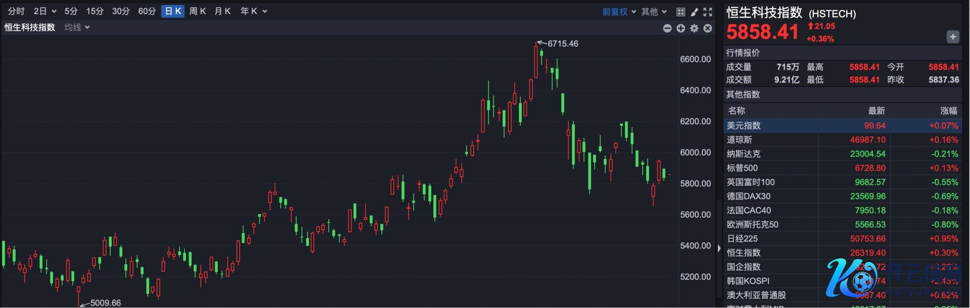恒生科技指数报5858.41点,飞腾21.05点,涨幅0.36%。