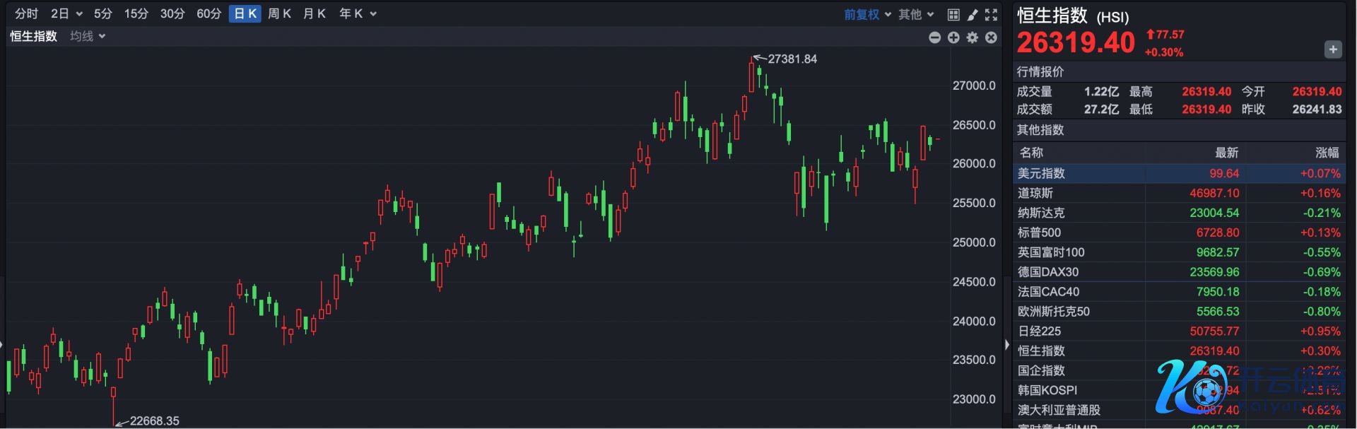 死心发稿,恒生指数报26319.40点,飞腾77.57点,涨幅0.30%。